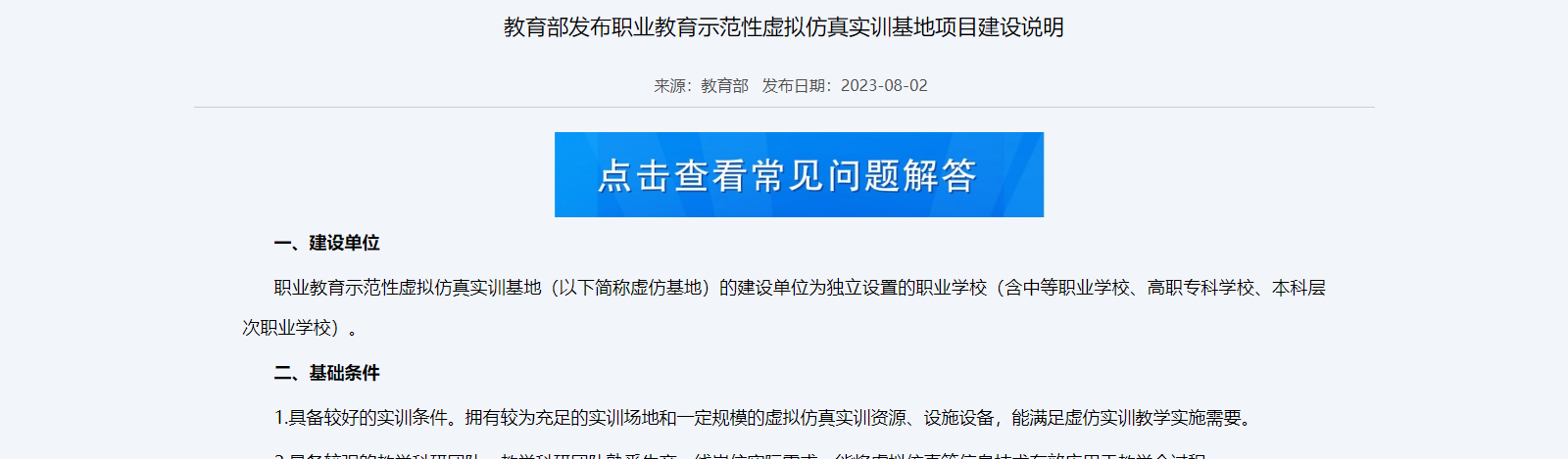 職業(yè)教育示范性虛擬仿真實(shí)訓(xùn)基地(以下簡(jiǎn)稱(chēng)虛仿基地)的建設(shè)單位為獨(dú)立設(shè)置的職業(yè)學(xué)校(含中等職業(yè)學(xué)校、高職專(zhuān)科學(xué)校、本科層次職業(yè)學(xué)校)。
